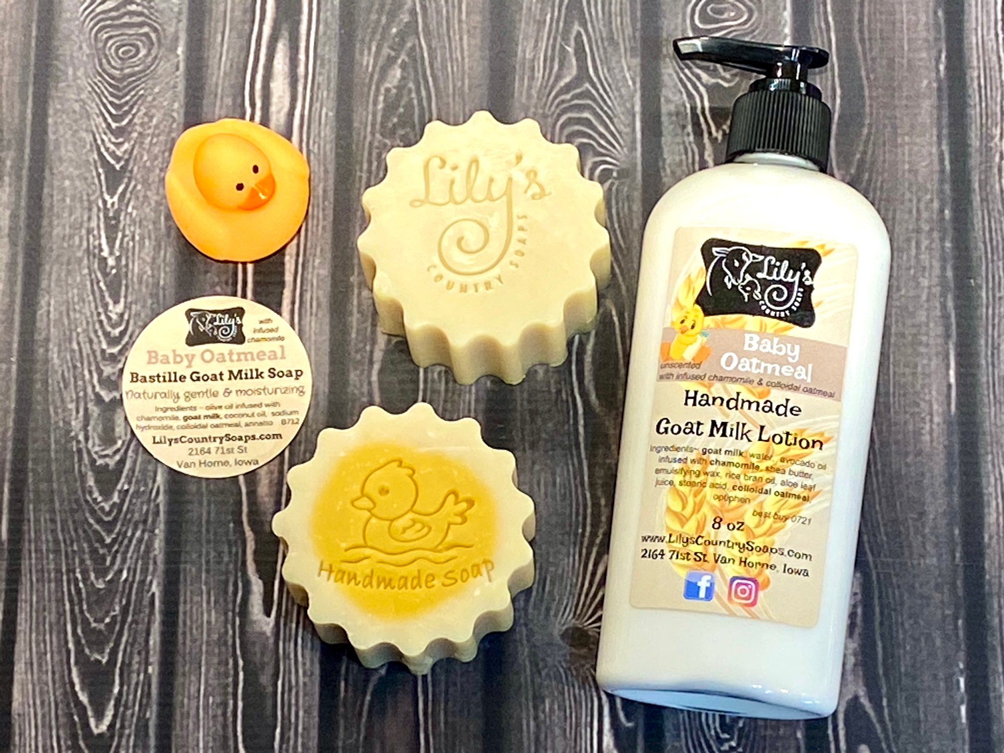Baby Oatmeal unscented Bastille (70% olive oil) goat milk soap, infused with chamomile and colloidal oatmeal. A simple, pure and all natural soap that’s very gentle and soft on the skin. Also a very nice facial soap.