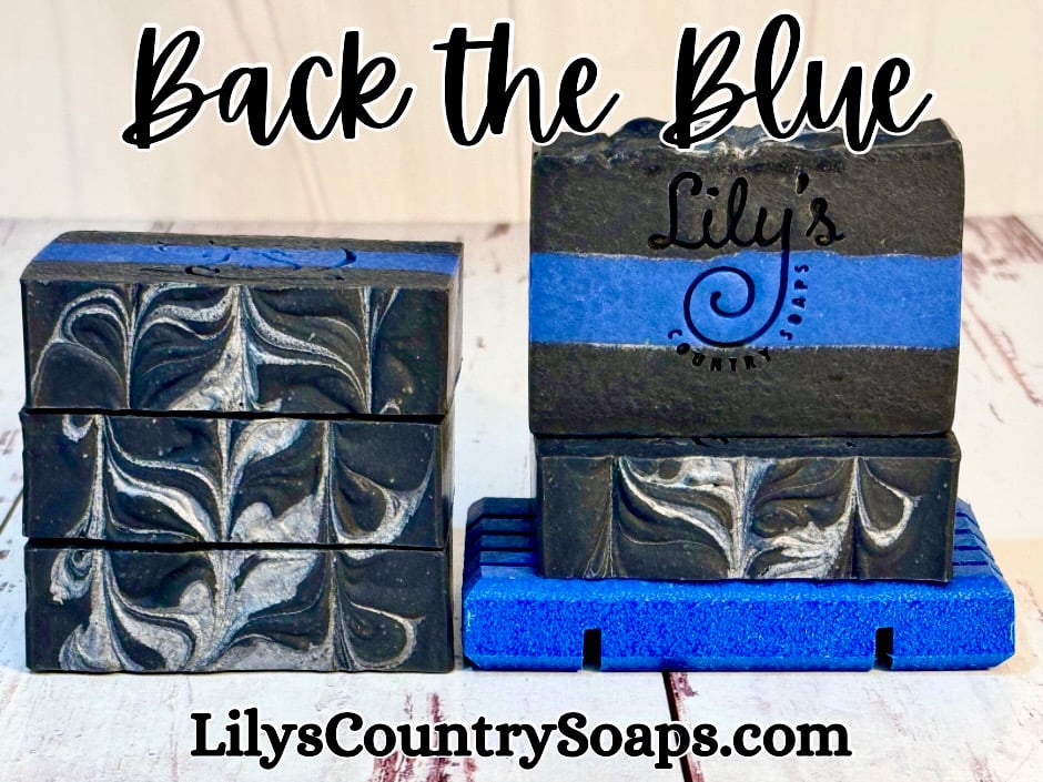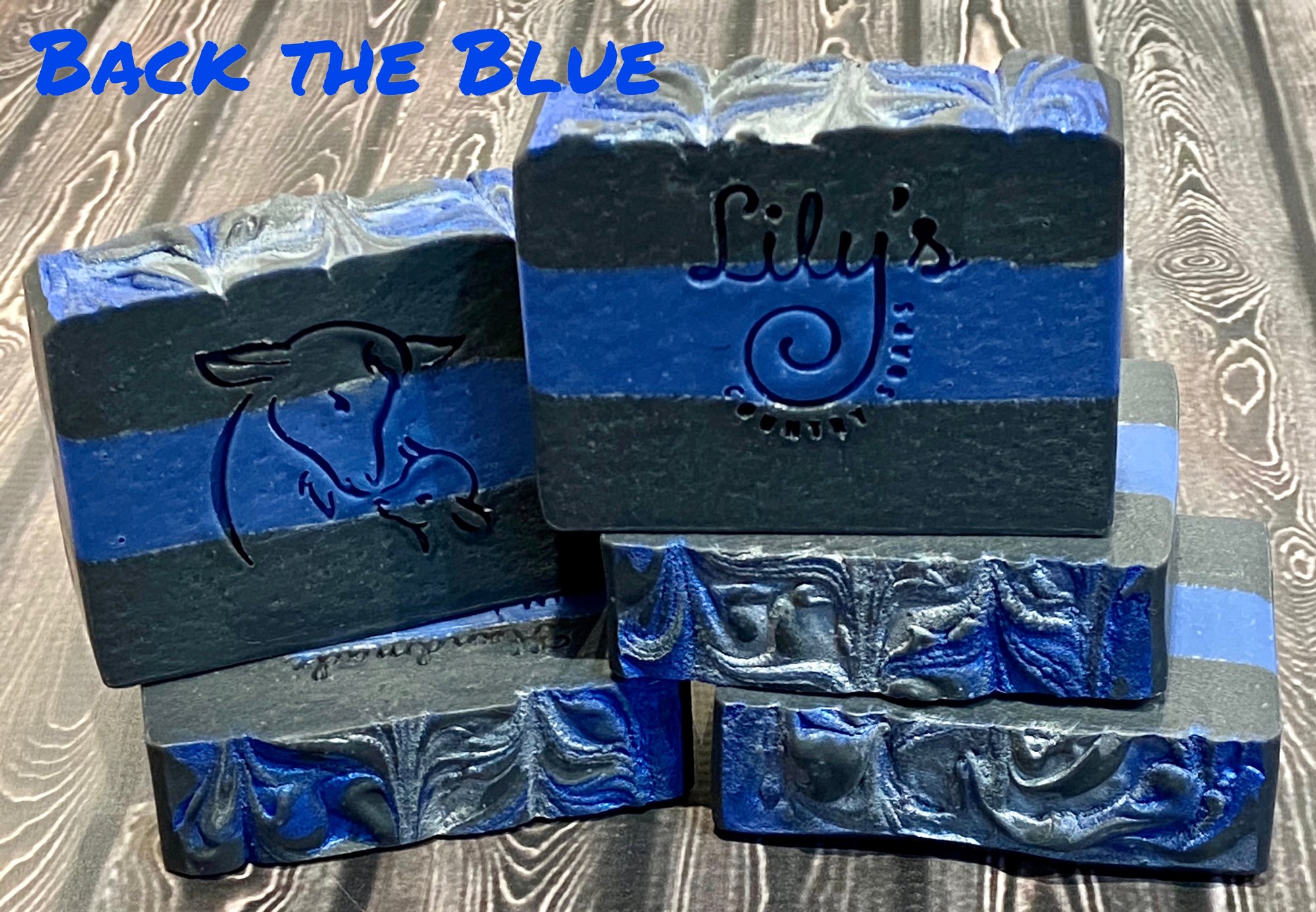 Back the Blue goat milk soap, a fresh, aquatic aroma with bergamot, neroli, and tangerine; flowing into mid notes of rosemary, jasmine, and persimmon; all sitting on a woodsy base note of essential oil of patchouli.