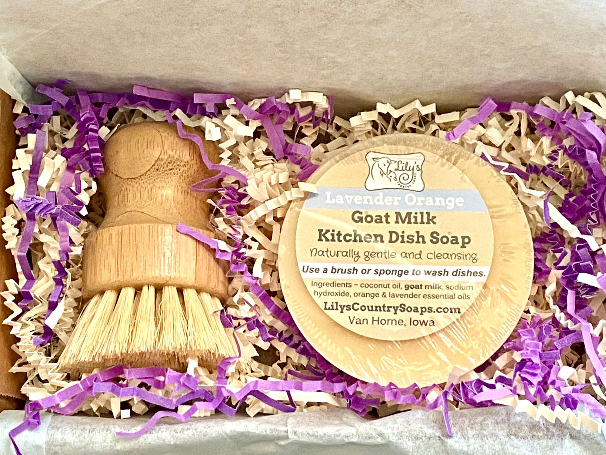 Goat milk kitchen dish soap, use a brush or sponge to wash your dishes. Detergent free.