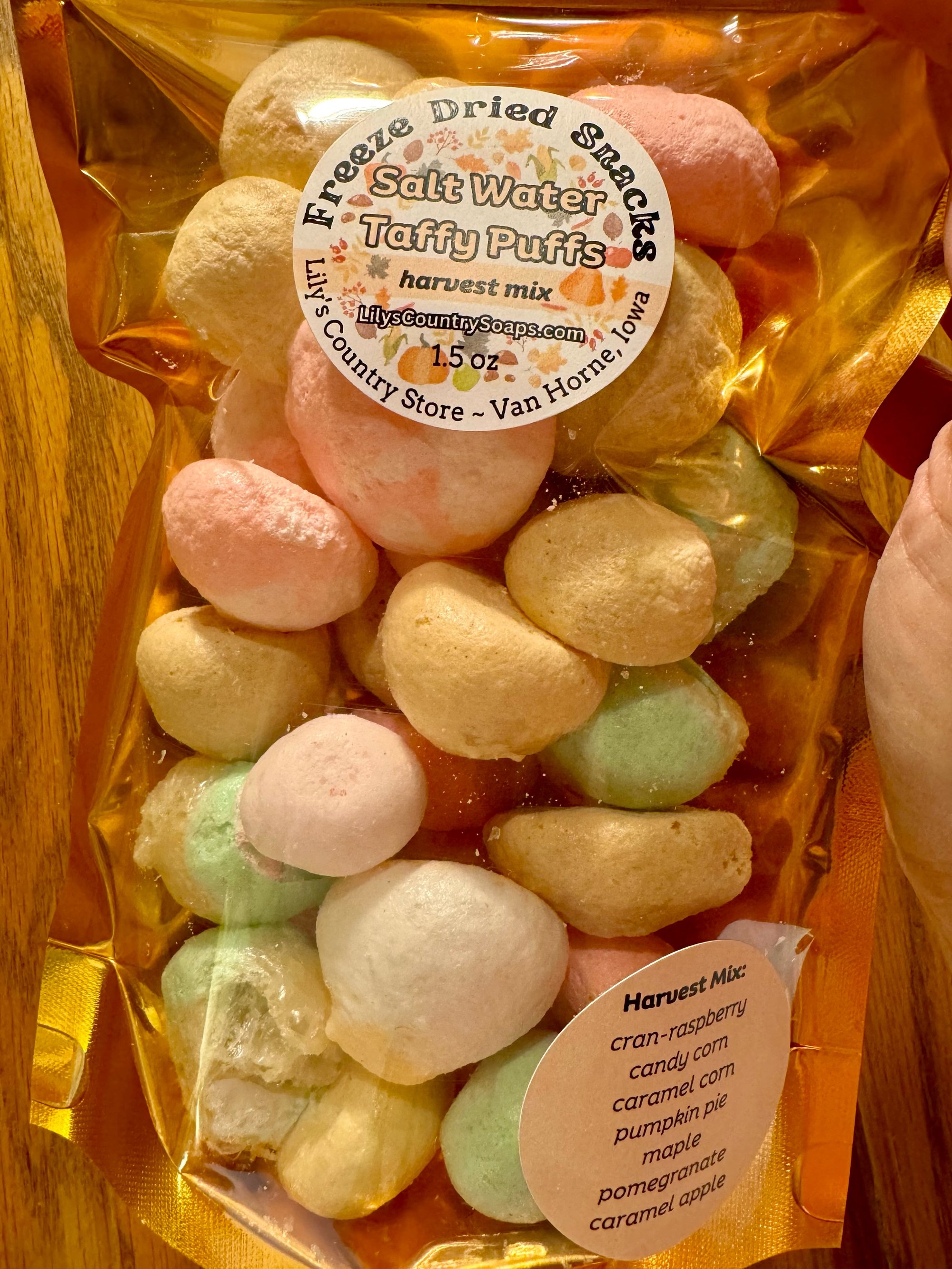 Harvest mix includes cran-raspberry, candy corn, caramel corn, pumpkin pie, maple, pomegranate and caramel apple.