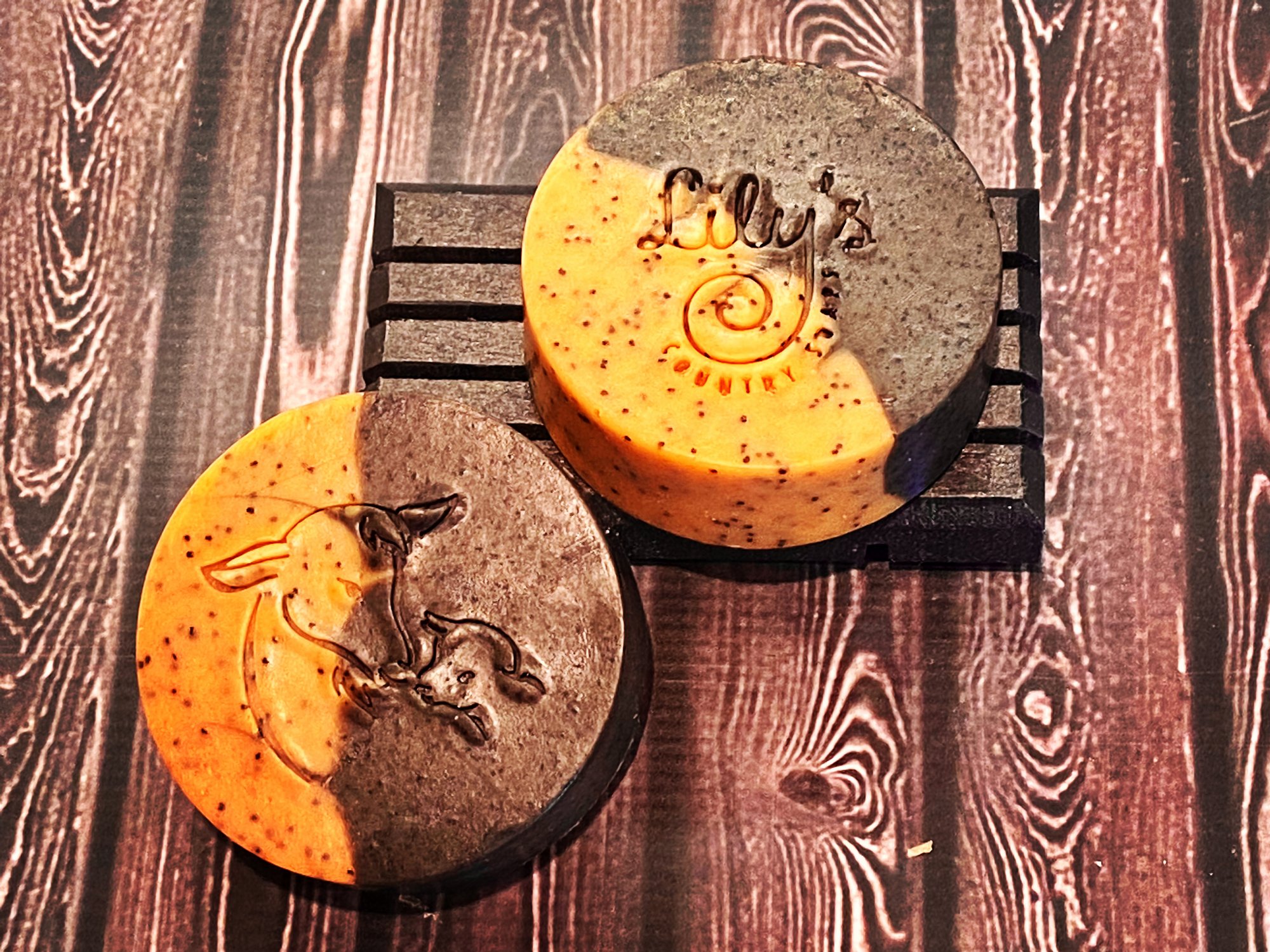 It contains olive oil, farm fresh goat milk, coconut oil, palm oil, sodium hydroxide, shea butter, castor oil, hemp seed oil, essential oils of blood orange, orange, tea tree and lavender, pumice, ground coffee, poppy seeds, orange peel powder, colloidal oatmeal, kaolin clay, activated charcoal, paprika.